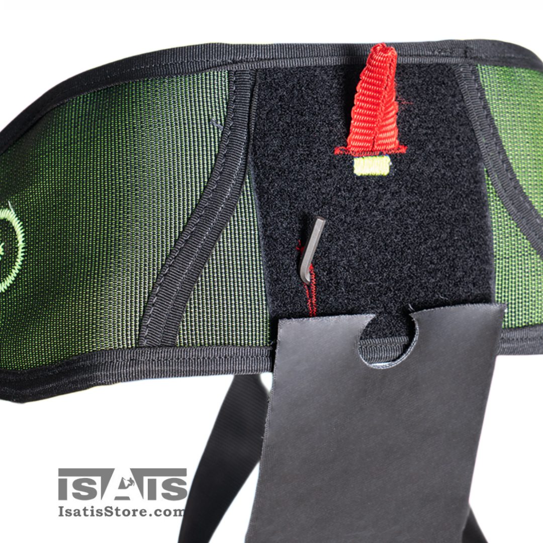 - یک چشمی کوچک جهت تعبیه آچار آلن برای باز و بسته کردن رینگ اوپن ها (حلقه های باز شونده) روی پد کمری هارنس دوخته شده است که توسط پد نشیمن مسدود می شود.